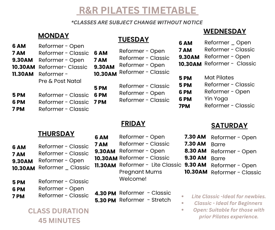 This is a perfect open level class suitable for clients who have done reformer Pilates before. Focusing on body movement & building strength while incorporating the use of our reformer beds, props & weights.